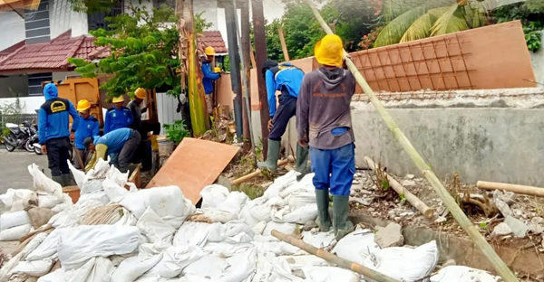 “Kami langsung bertindak setelah mendapatkan laporan kerusakan turap dan robohnya saluran air di tengah hujan deras kemarin. Sementara waktu, turap yang rusak dilakukan penambalan dan pengamanan menggunakan kisdam, sedangkan drainase yang jebol masih menunggu perbaikan permanen dalam waktu dekat ini,” ujar Iwan.