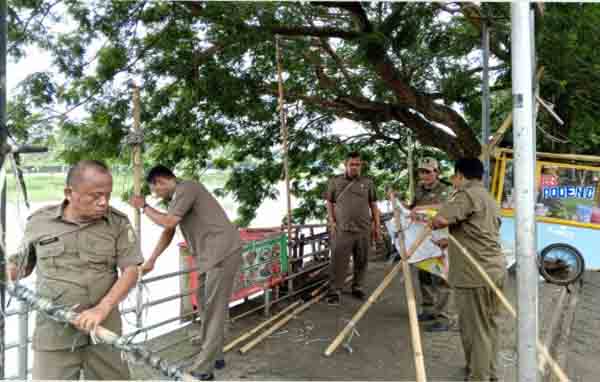 KOTA TANGERANG, KONSEPNEWS – Petugas Ketentraman dan Ketertiban (Trantib) Kecamatan Tangerang melakukan pembongkaran lapak pedagang permanen dan semi permanen di bantaran Sungai